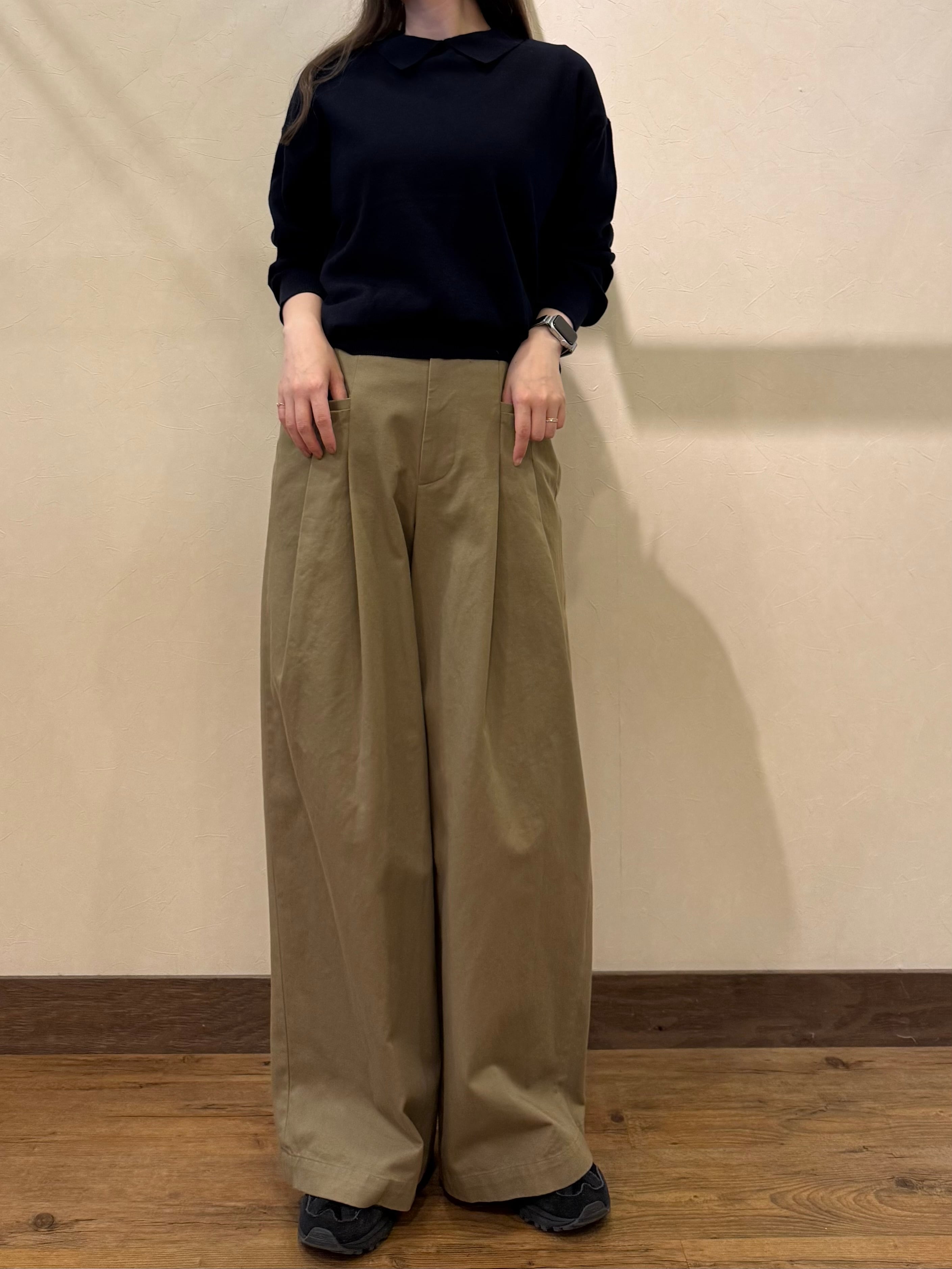 ブラウジングするコトでボリュームのあるボトムスとも好相性です。