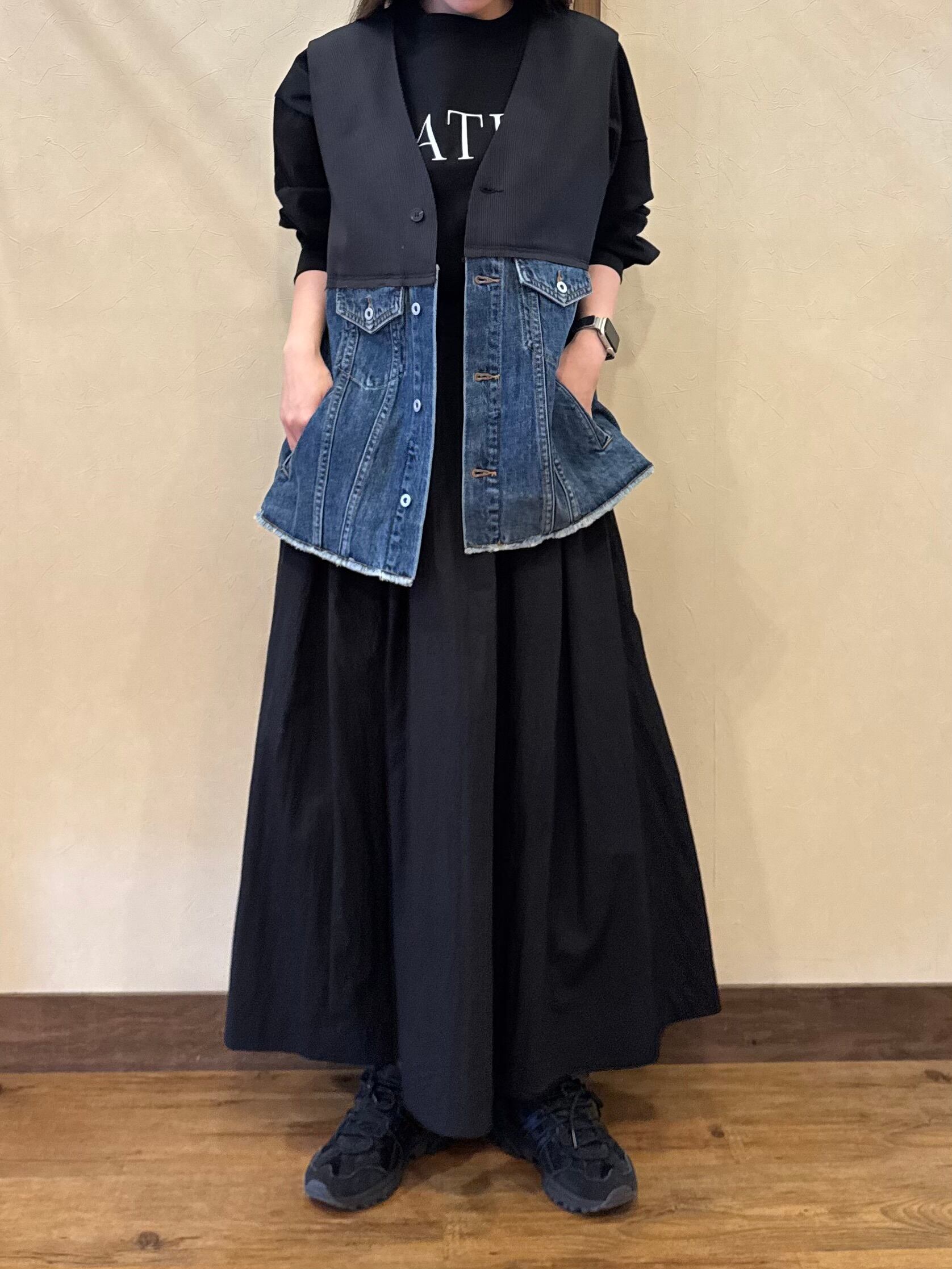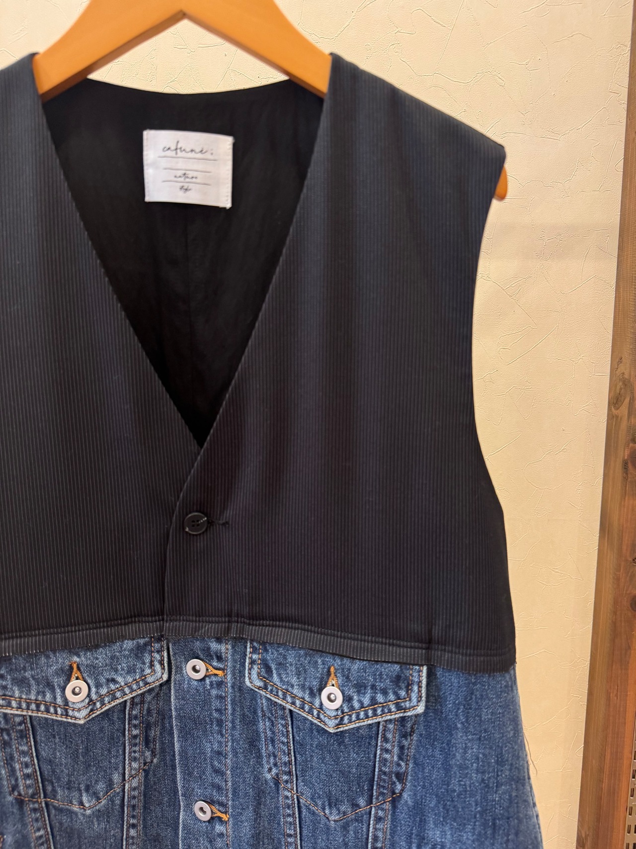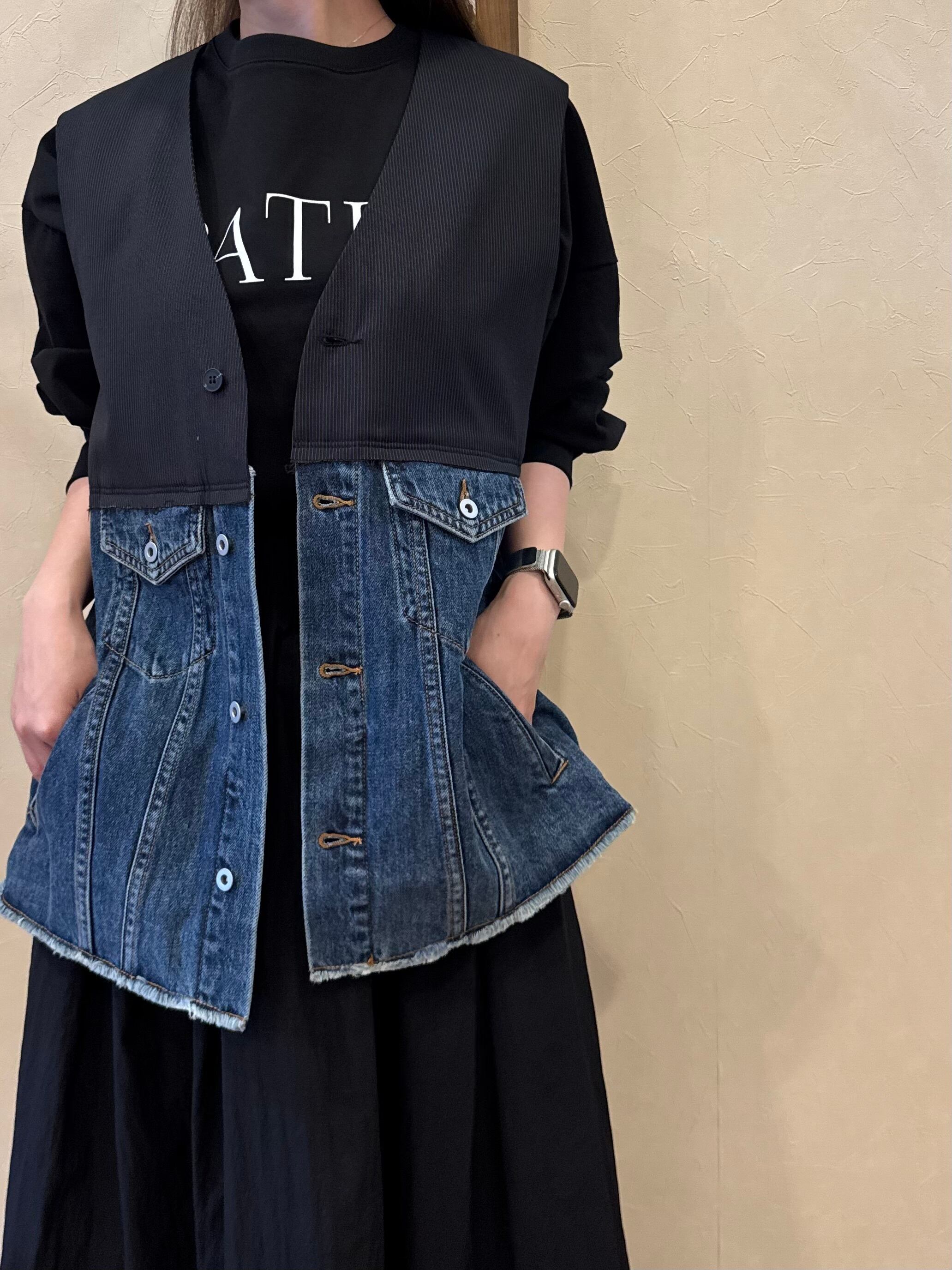 ドッキングデニムベストは異素材MIXが光るトレンド感満載の一枚。
