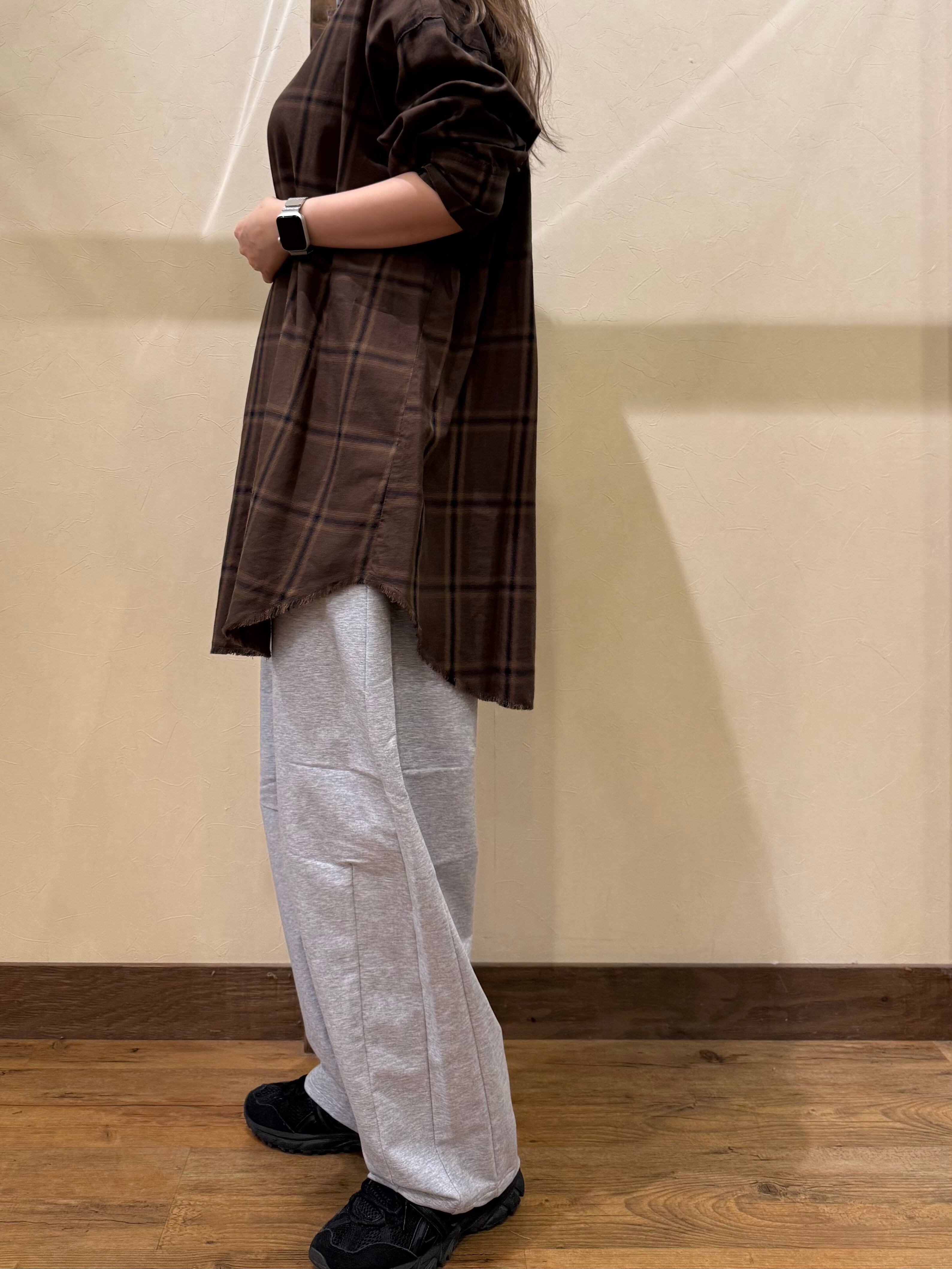 グラデーションがかかったような、落ち着いたチェック柄なので幅広いテイストに◎裾は切りっぱなしのラフな表情がポイントです。