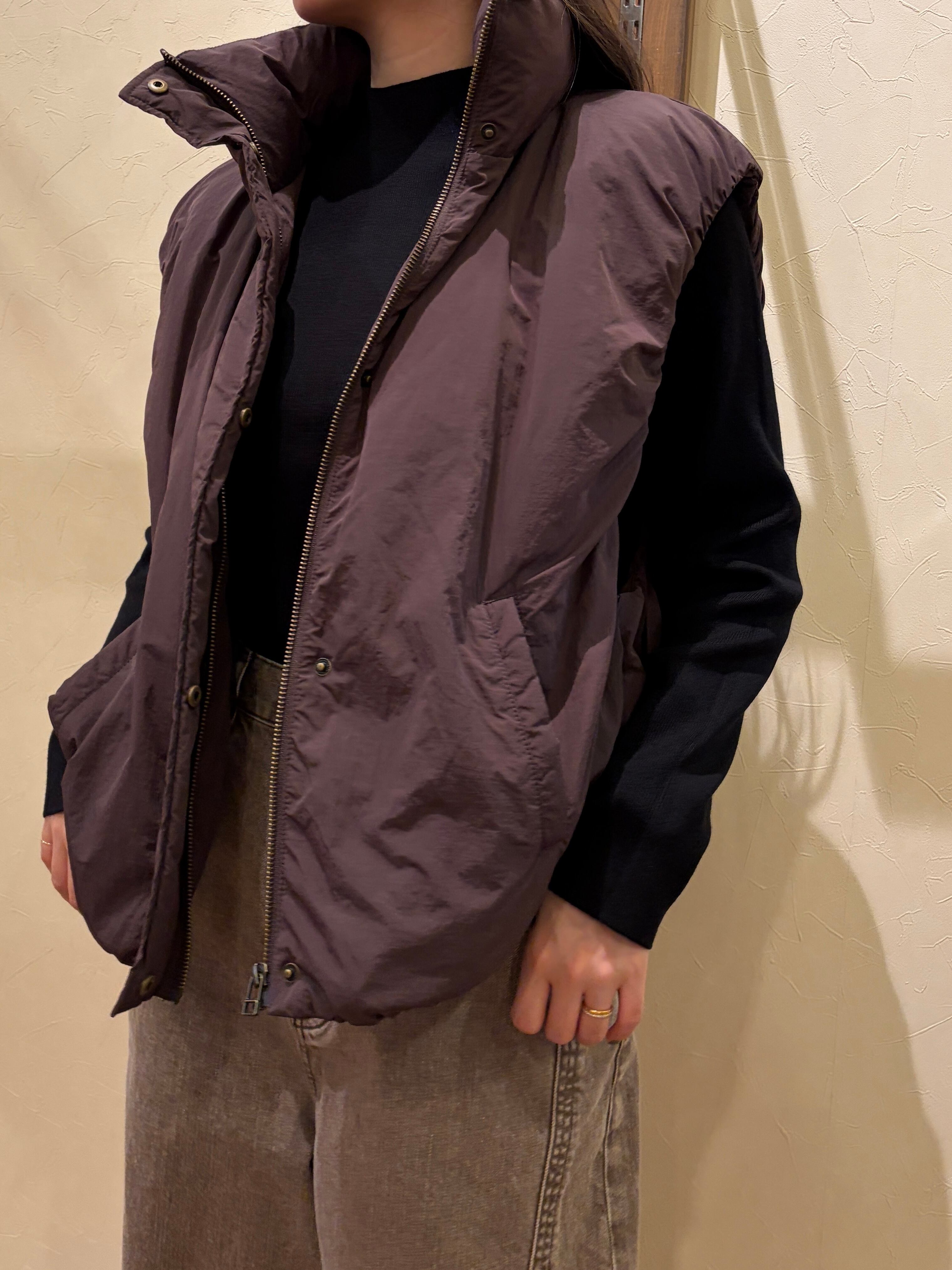 ボリューミーなバルーンシルエットが今っぽい薄中綿ベスト。