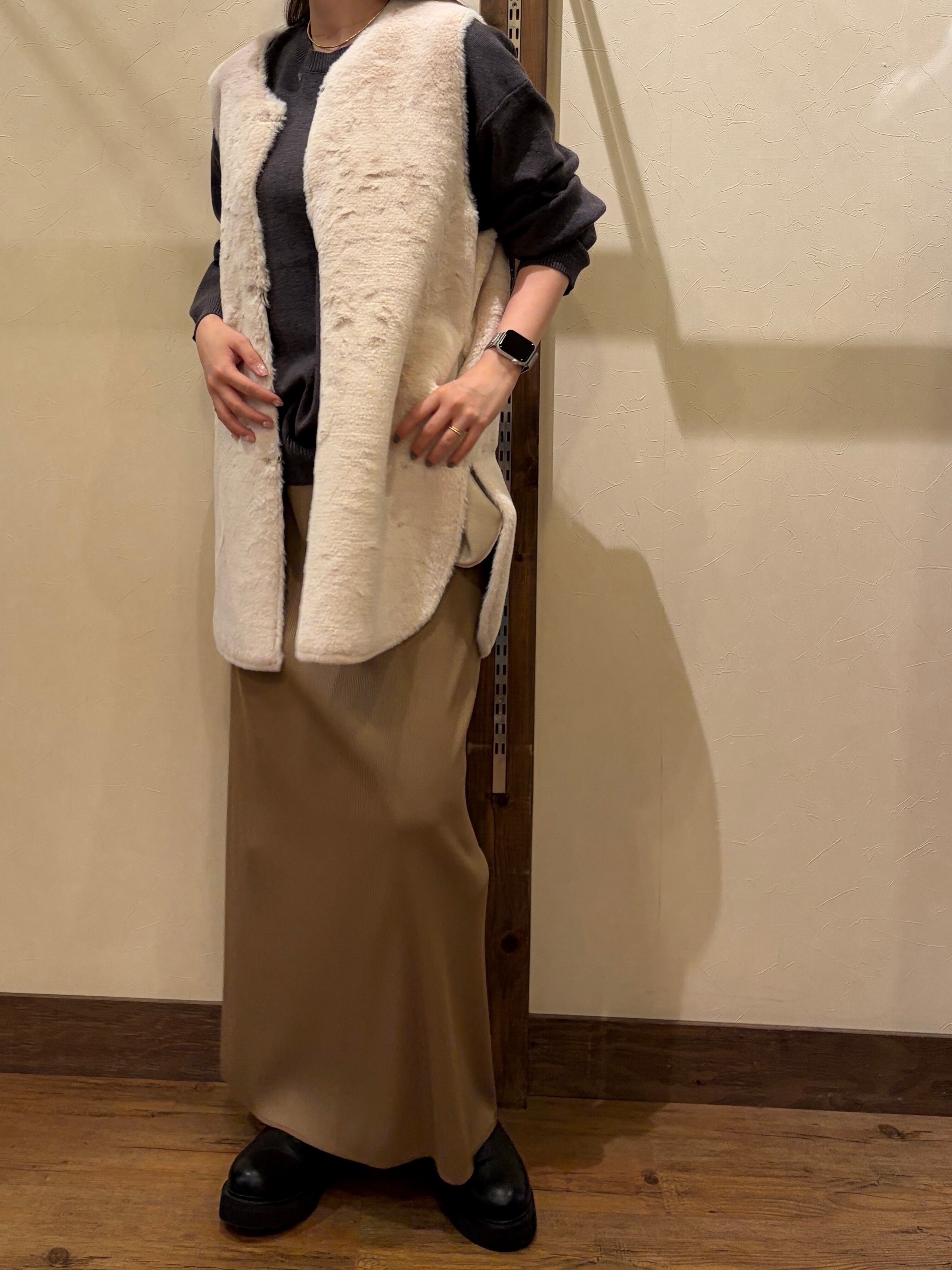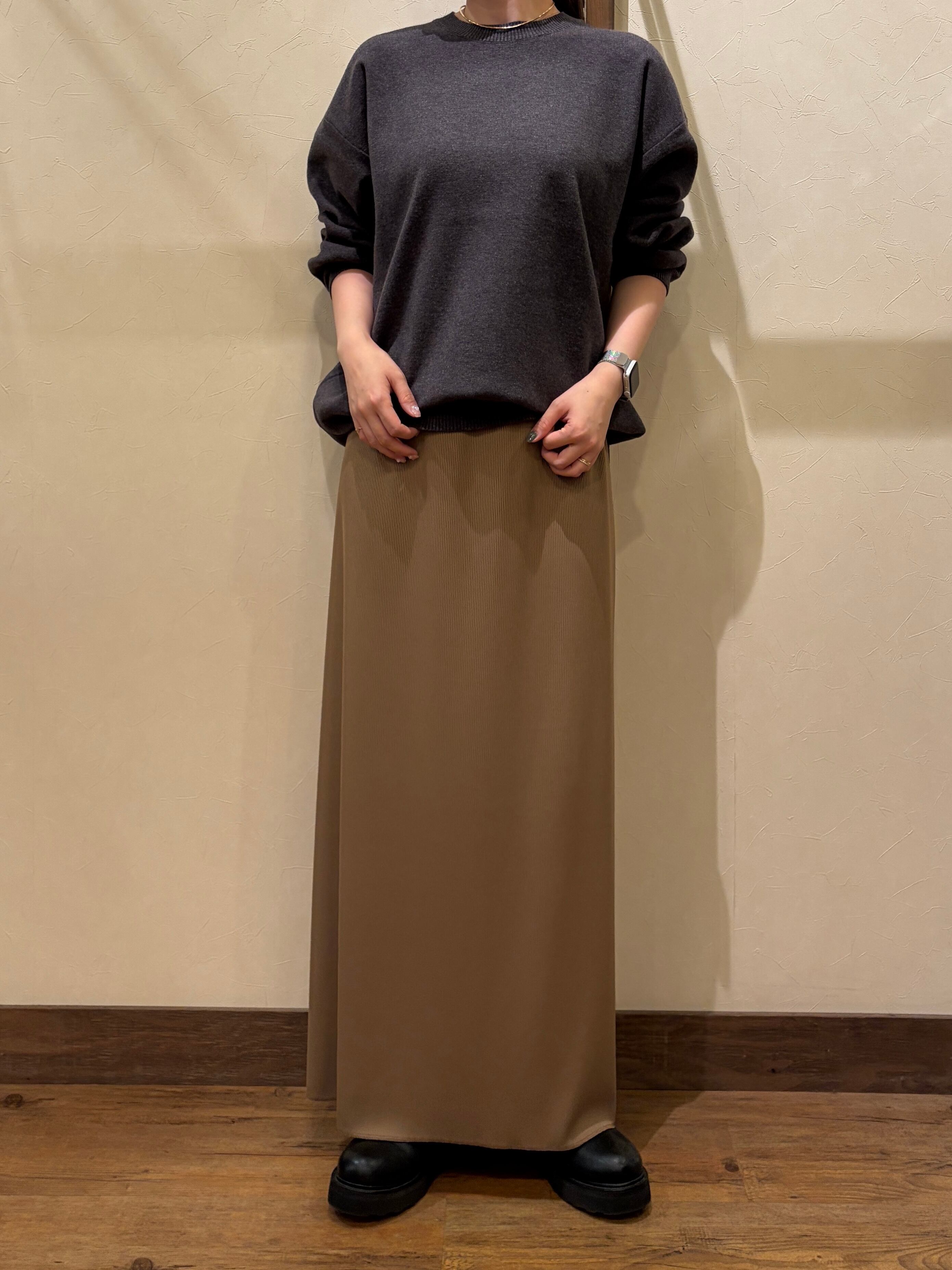 前後差をつけて、パンツでもヒップ周りが目立ちにくく、スカートでも相性の良い丈感です。