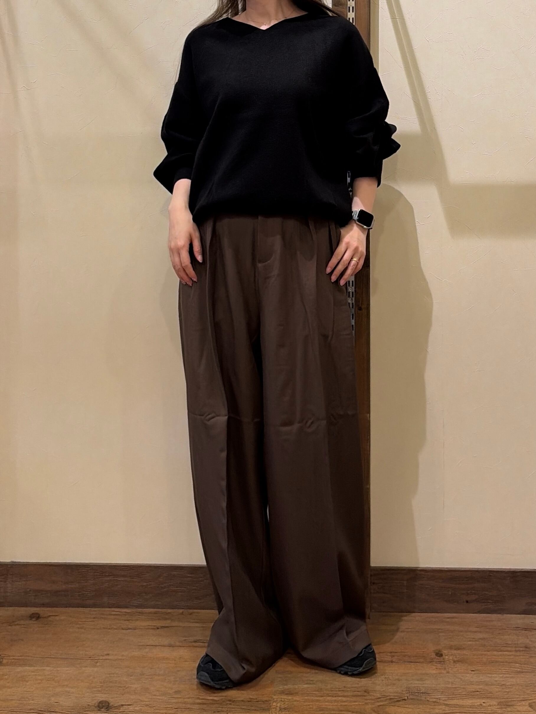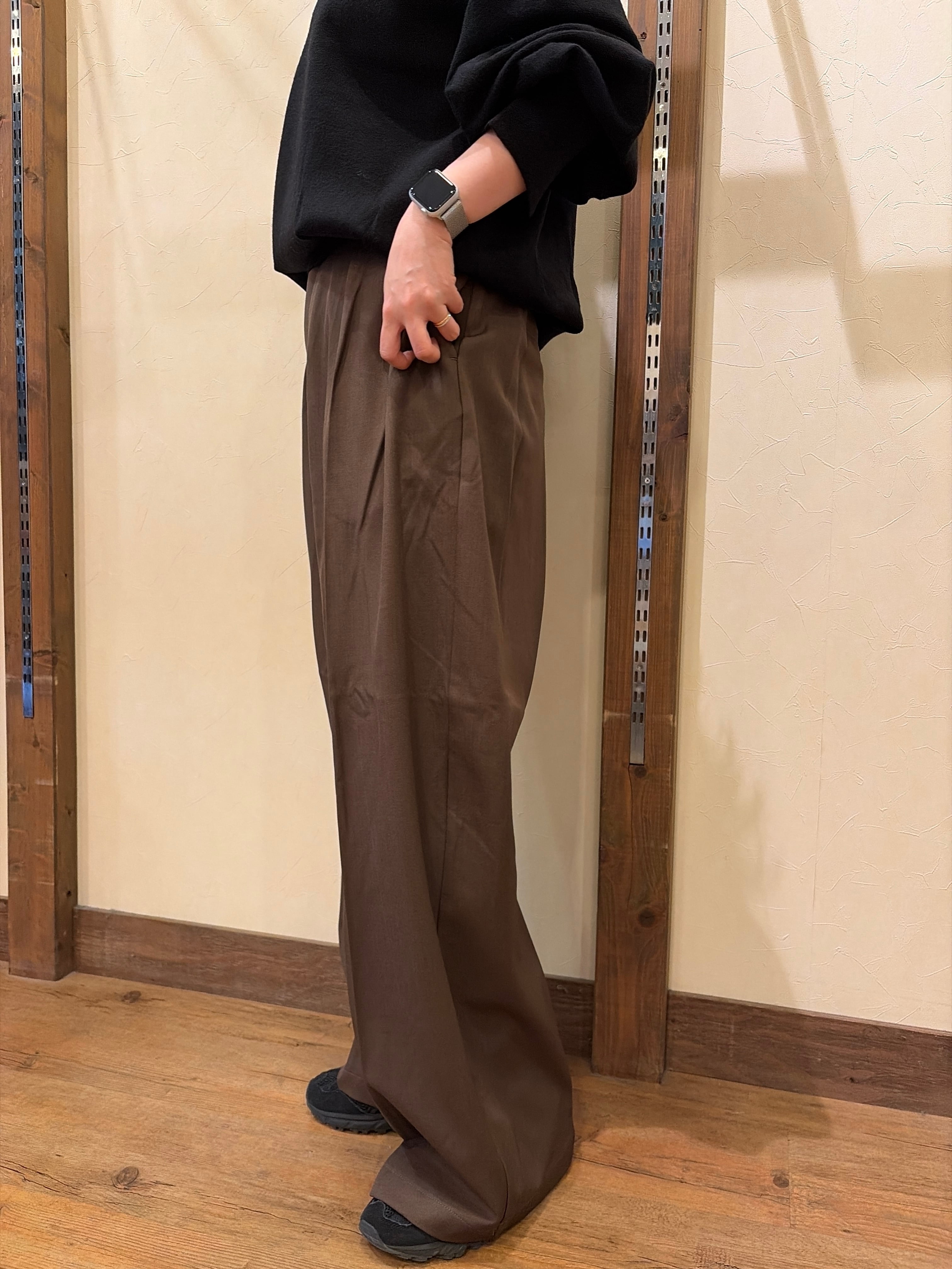 ウエスト内側に別布ヘリンボーンを使い、パイピング始末でさらに高見えします。ウエストは、バックゴム仕様なのでストレスフリーです。2本タックで、すっきりとした着用感が魅力です。