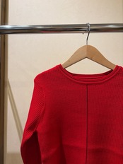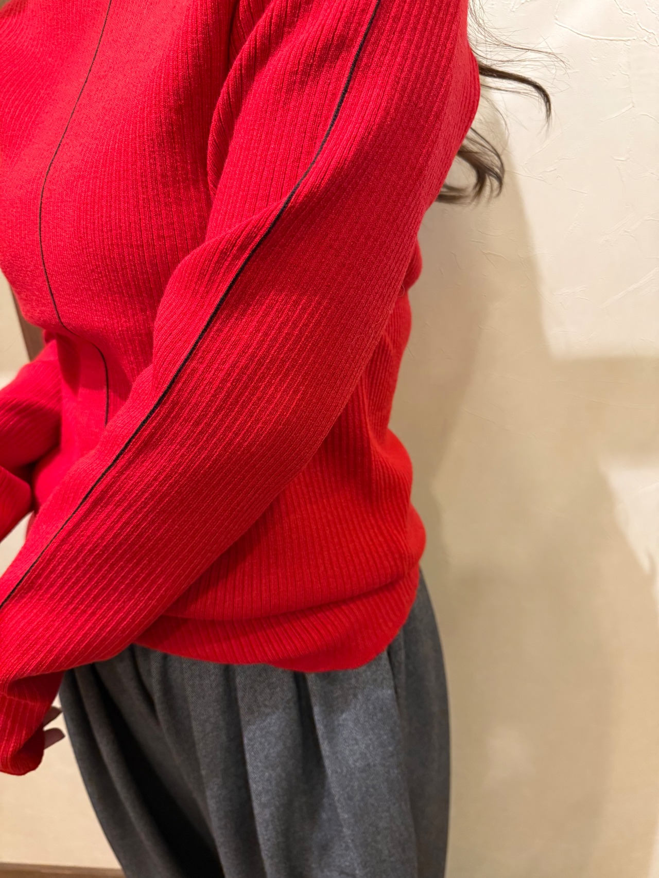大人な印象で、着用しやすいラインの太さとカラーにしています。ほどよく体にフィットするサイズ感ですが、立体感のあるランダムリブ編みで、体のラインを拾いすぎず、着心地が良いニットです。