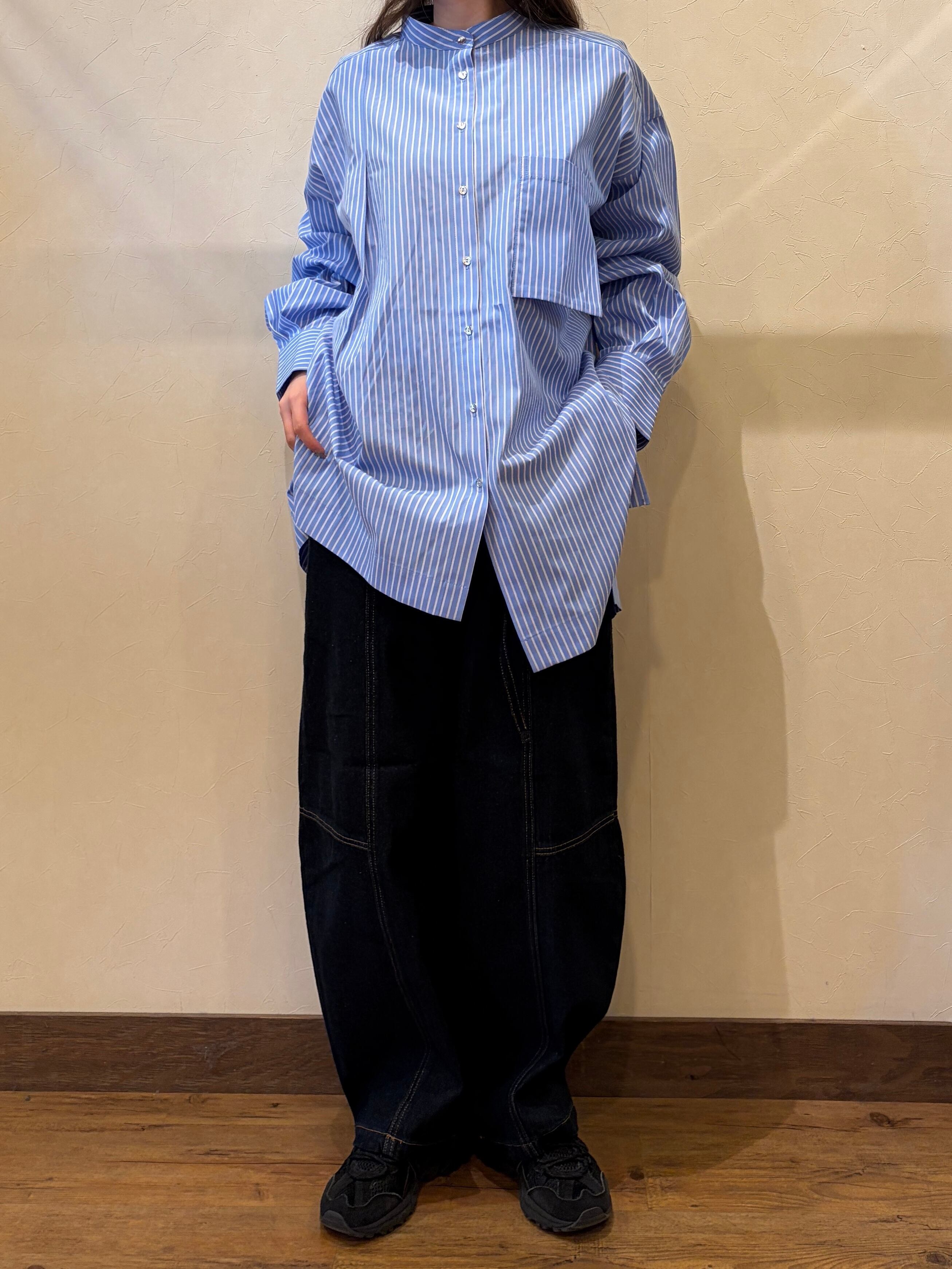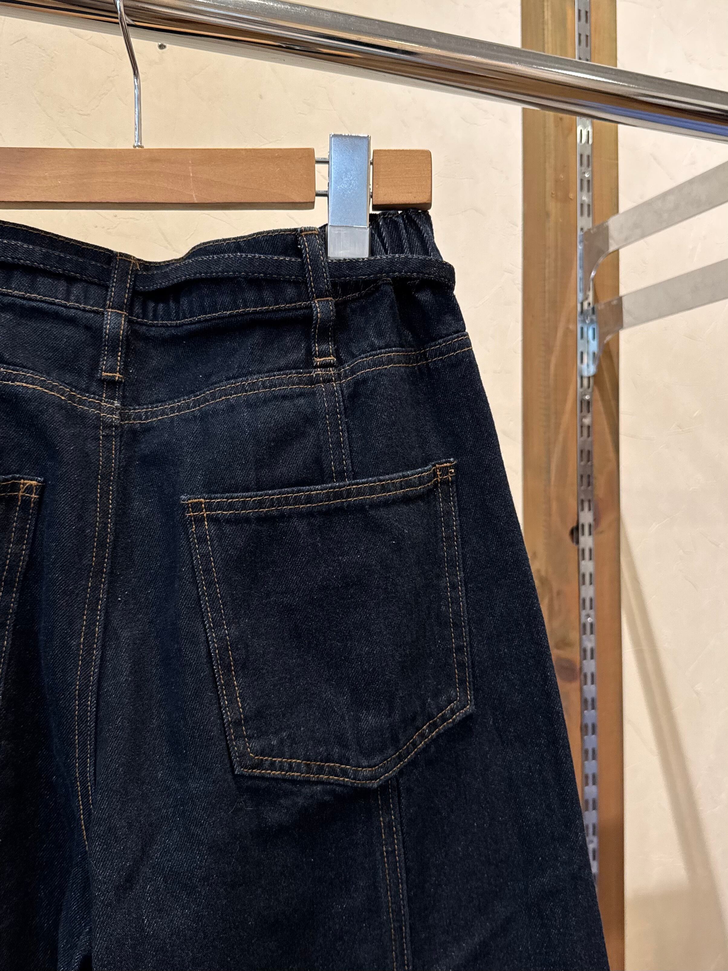 膨らみすぎないように、フロントとバックに切り替えを入れて、シルエットにこだわりました。ウエストにはベルト付きで、ベルトループはW仕様なのでアレンジが可能。トレンド感あるアイテムですが、通年使えるデニムアイテムなので、ベーシックなシルエットのパンツとは違ったスタイリングが楽しめるアイテムです。