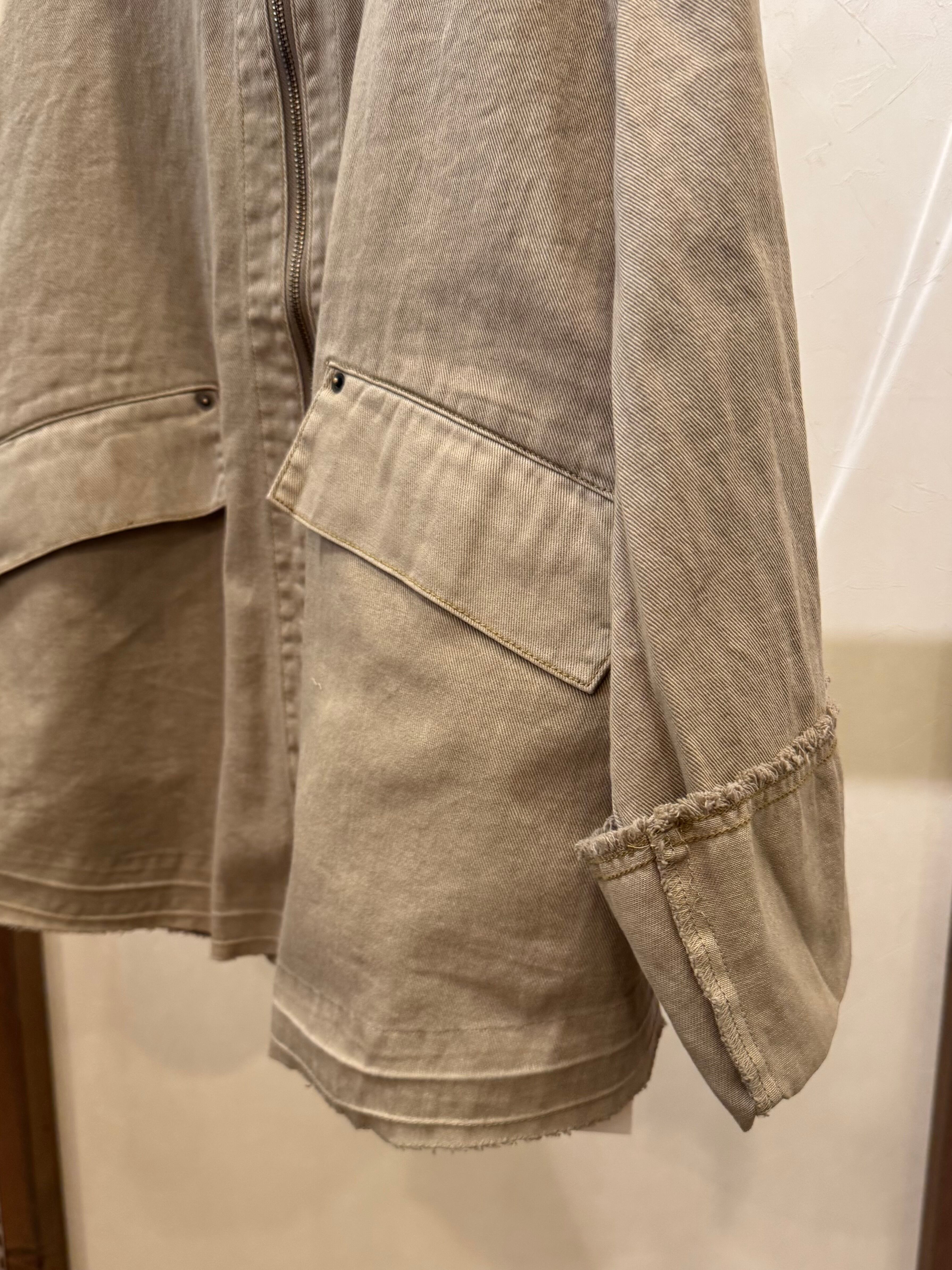 少し大きめの襟と広めの袖幅がポイントです。袖口は裁ち切りにしており、特有のused加工感が楽しめます。ファスナーはWジップにすることで、裾だけ開けたりと着こなしが楽しめます。