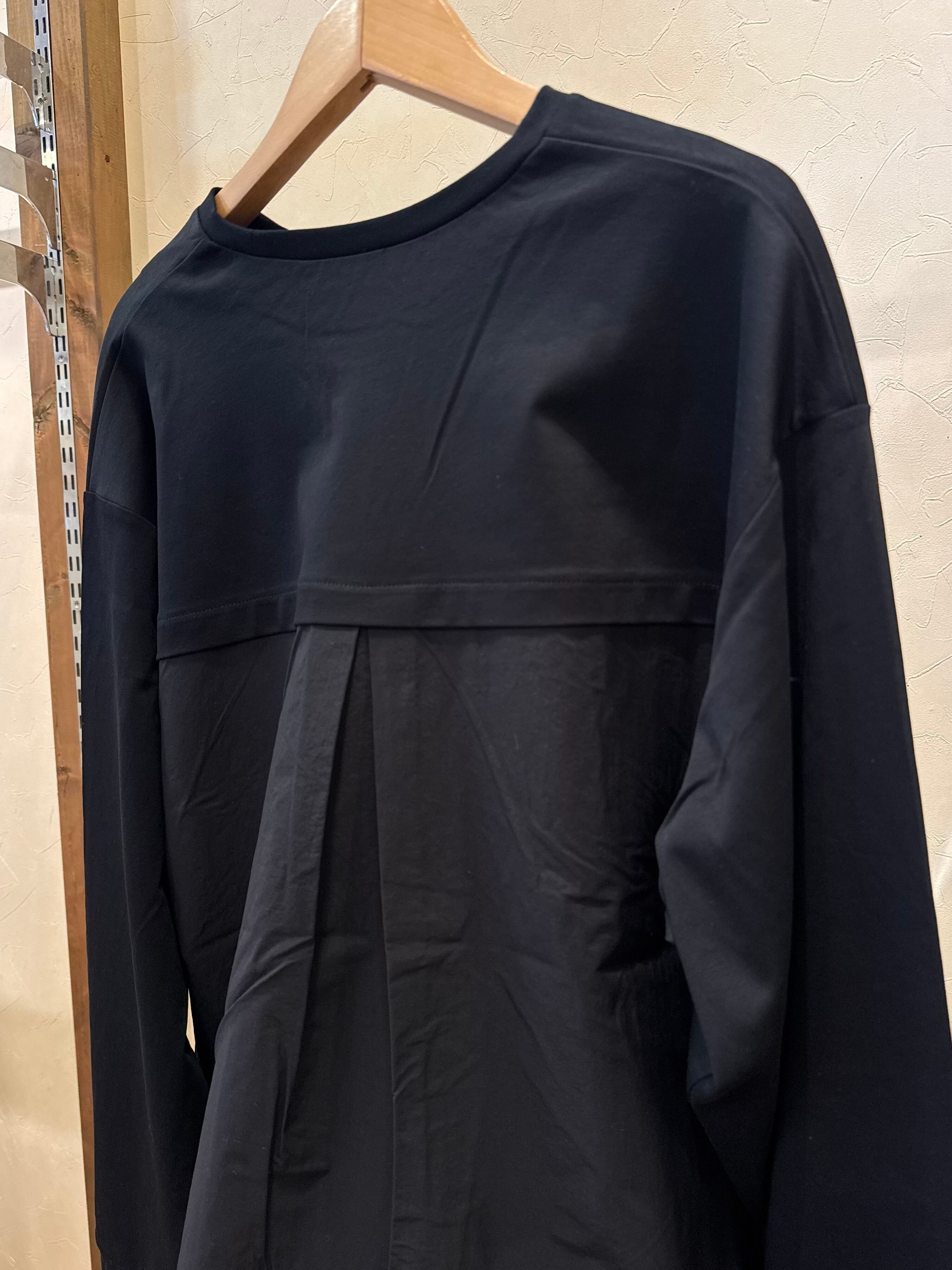 裾とバックスタイルに同色系の布帛をドッキングしたプルオーバー。