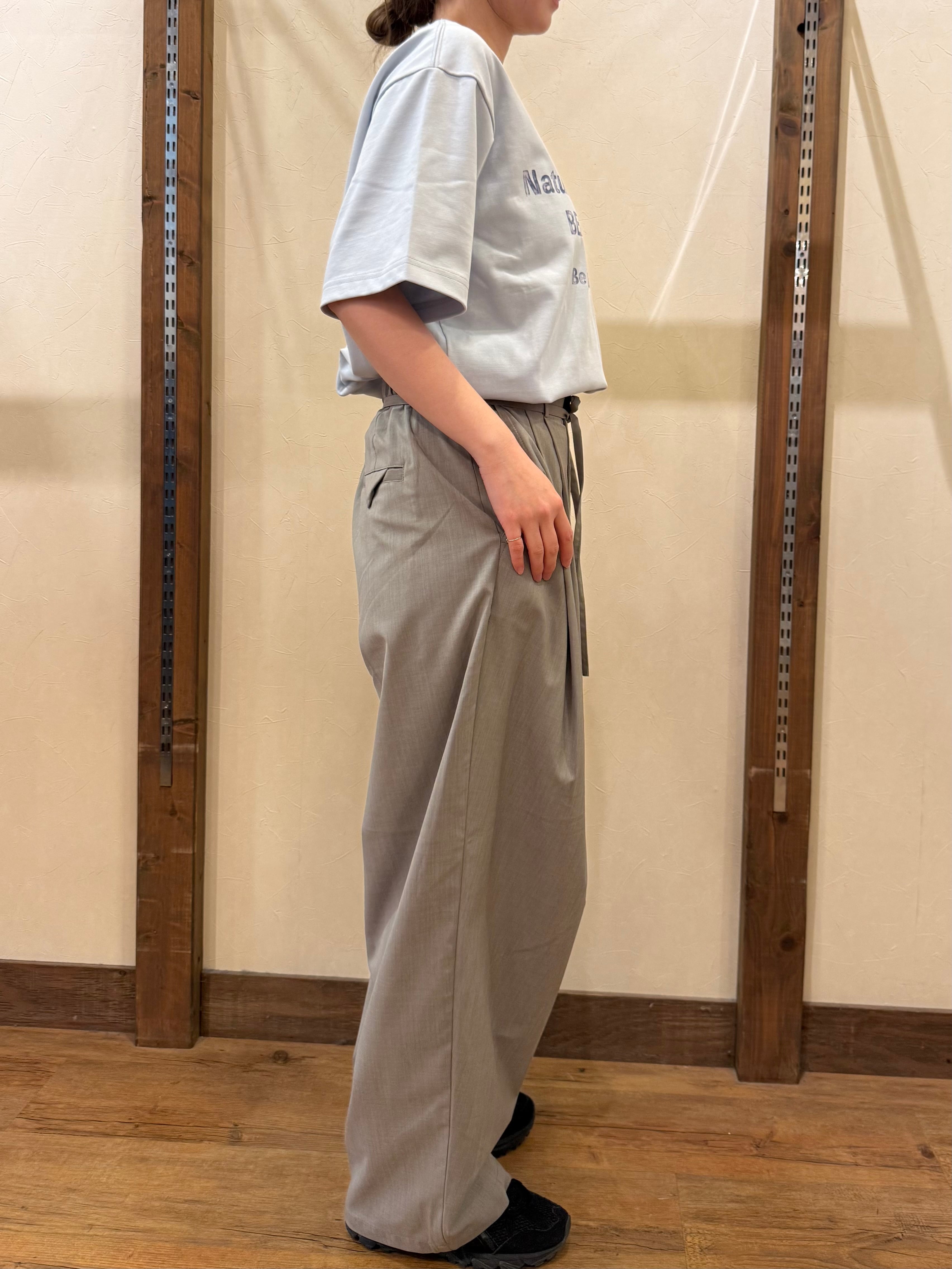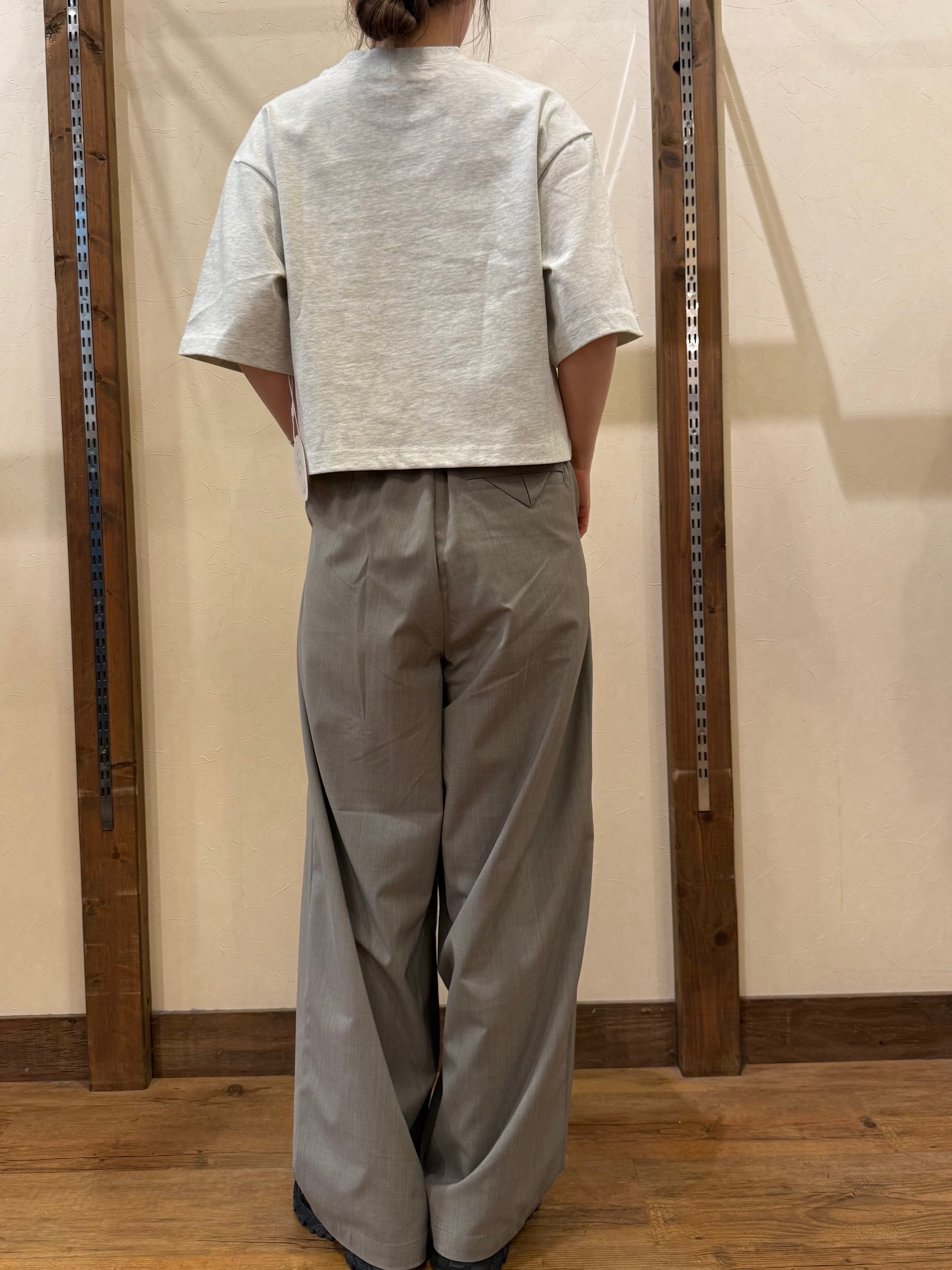 フロントのタックが立体感を出し、腰まわりに余裕があるから体のラインを拾いにくいのがポイント。