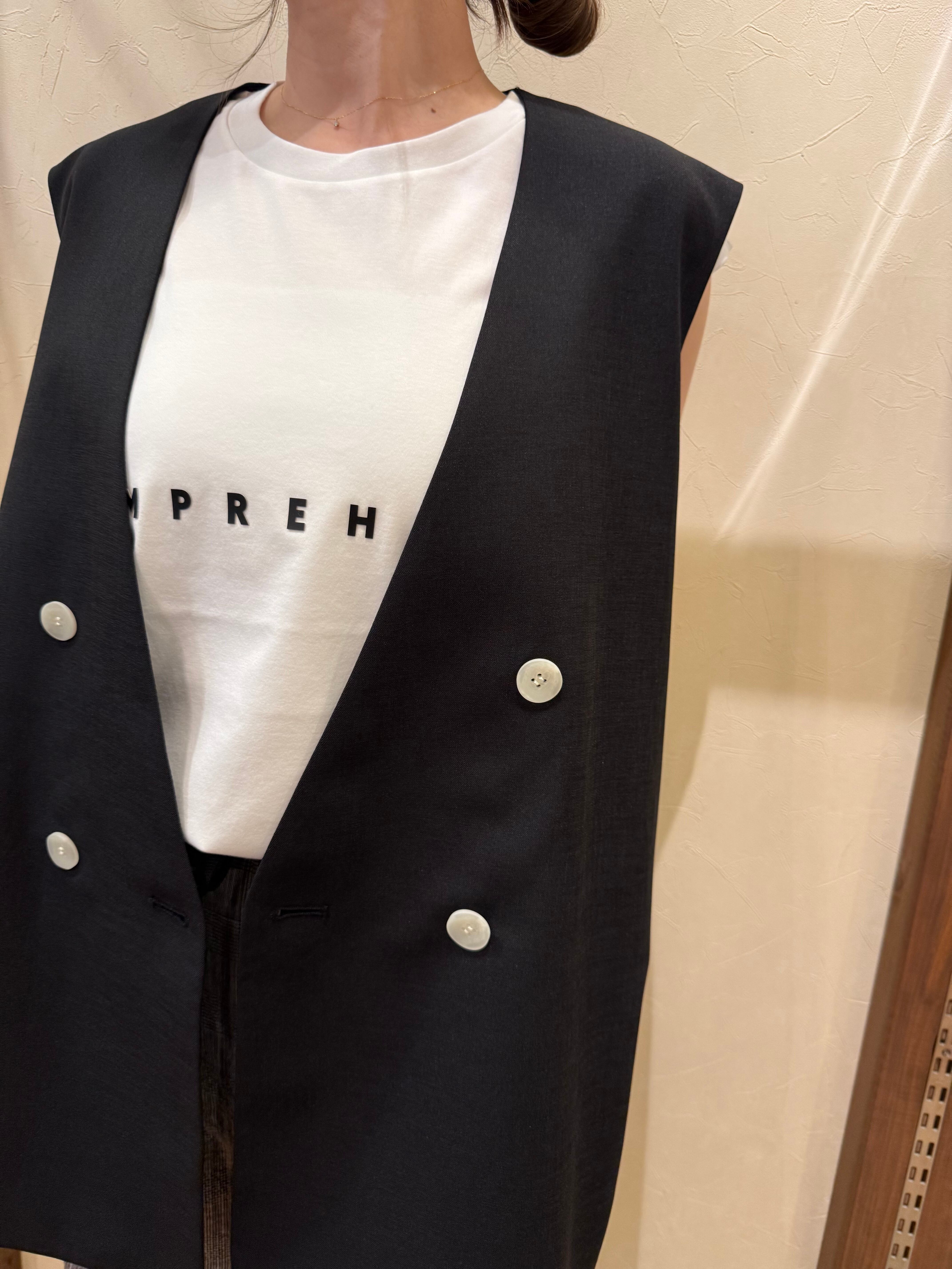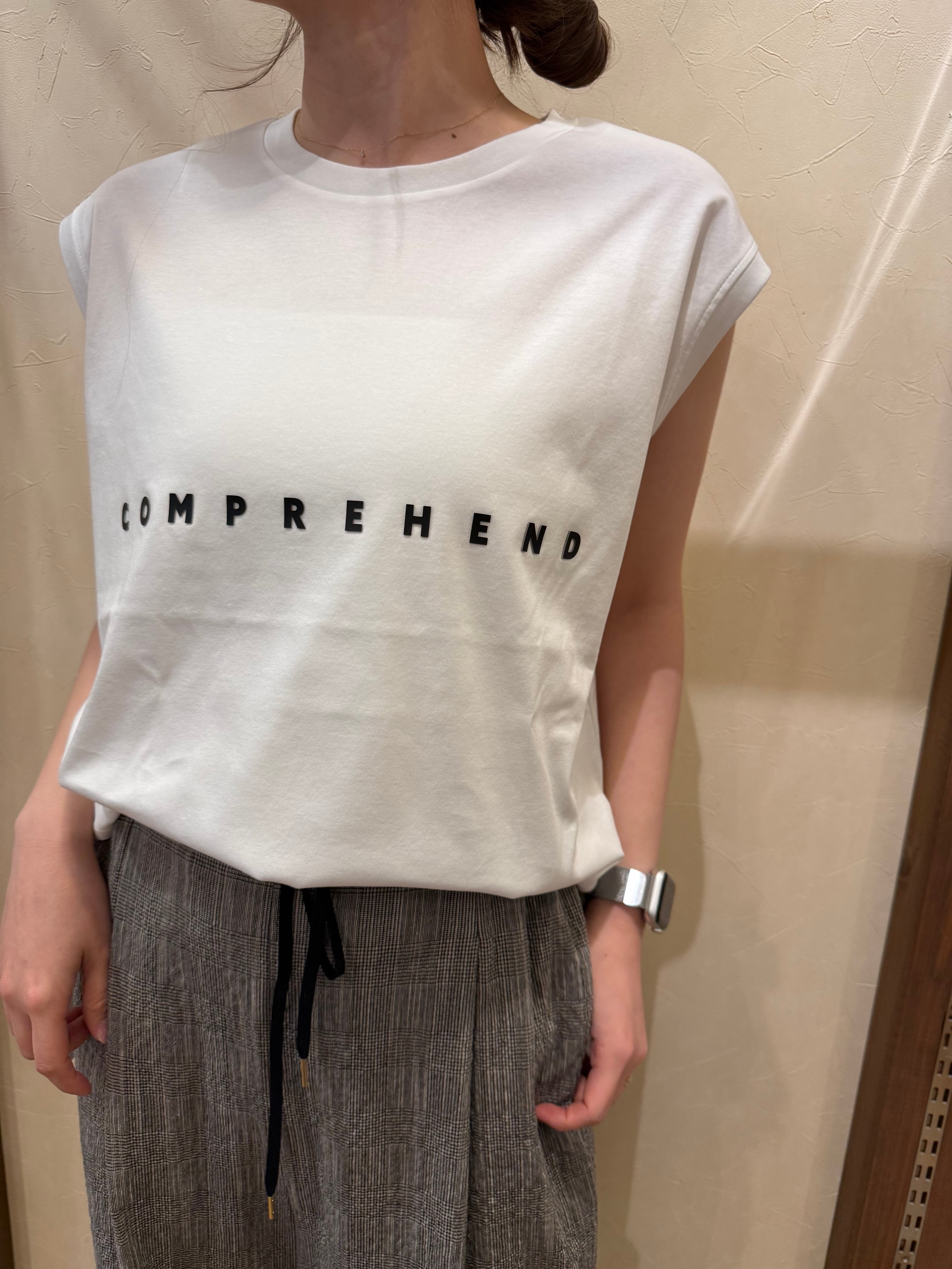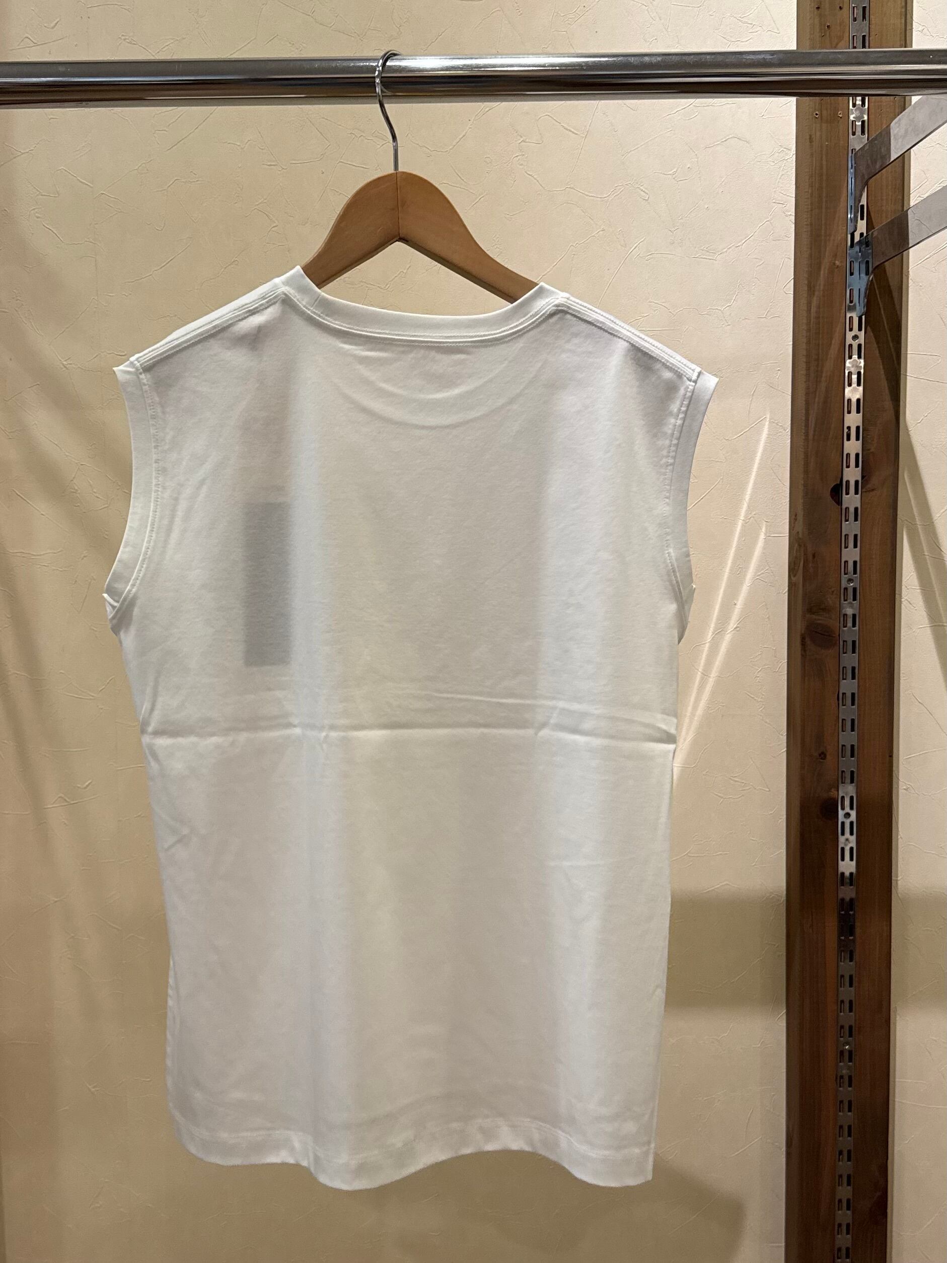 こなれ感のあるミニマムなロゴプリントを、何度も重ねたシリコンプリントで表現しました。サイドから見える色と表面の色も変え、立体的なロゴで高見えします。アームホール下がりは、より着用しやすいように微調整して上げています。