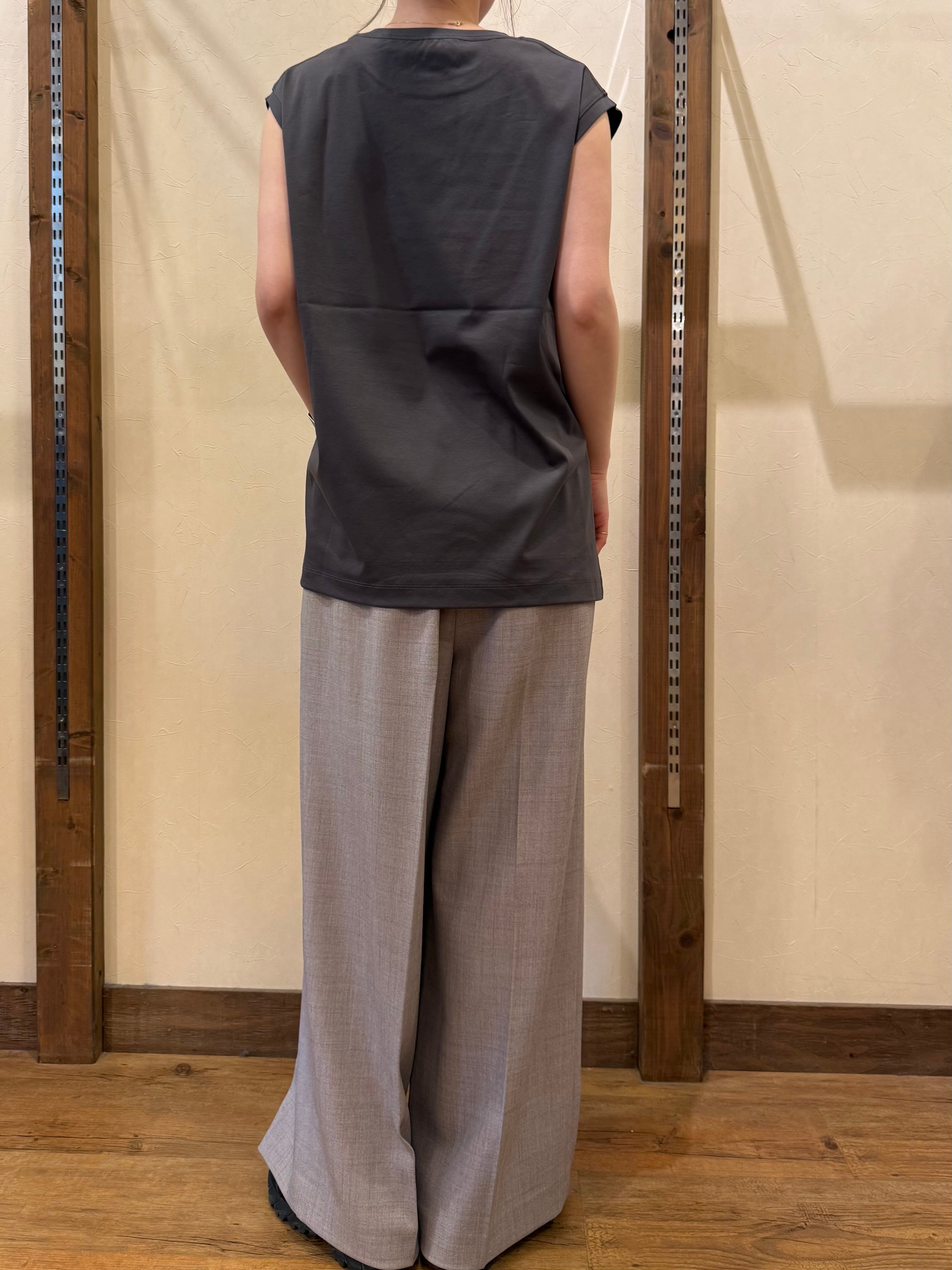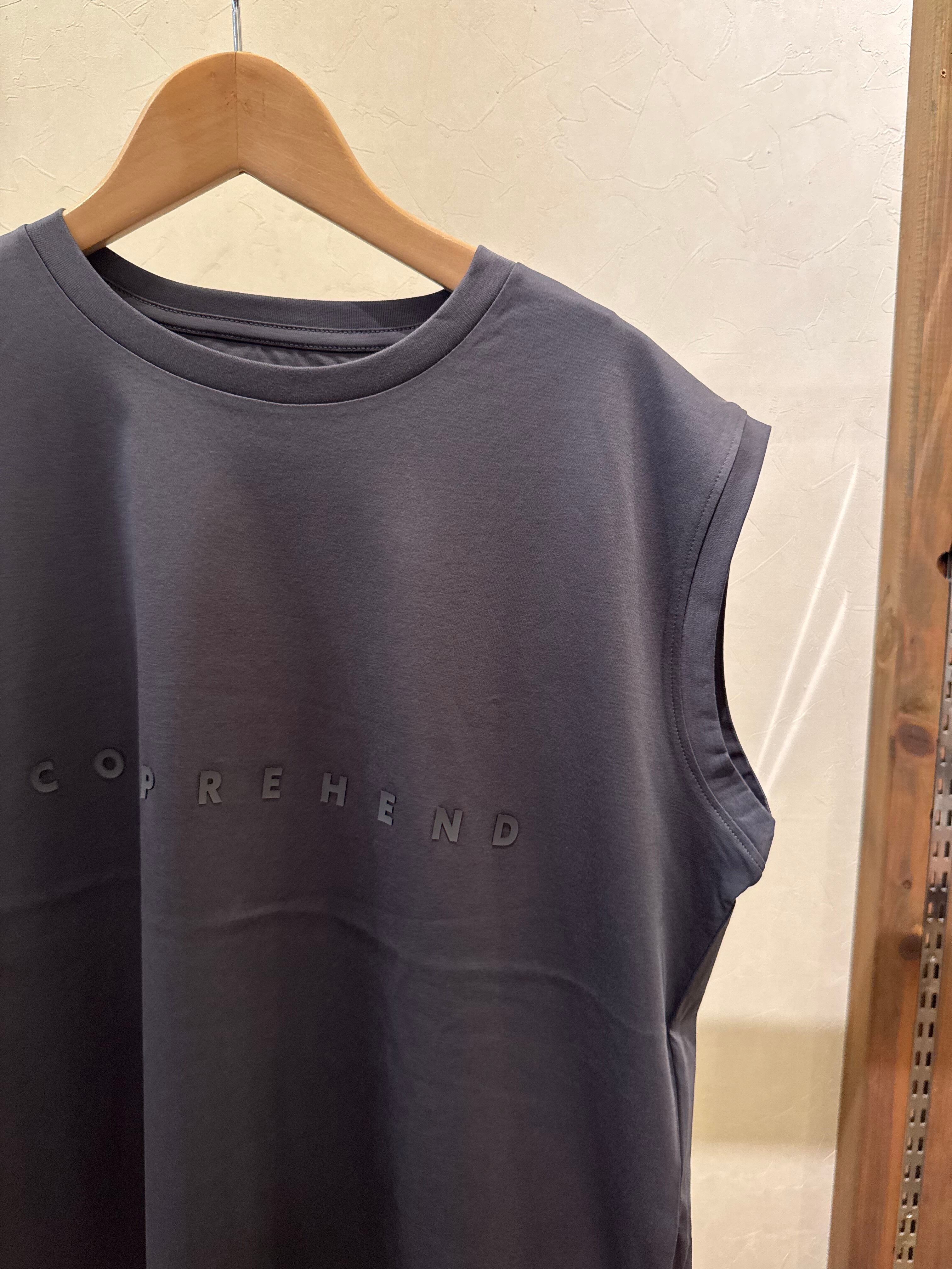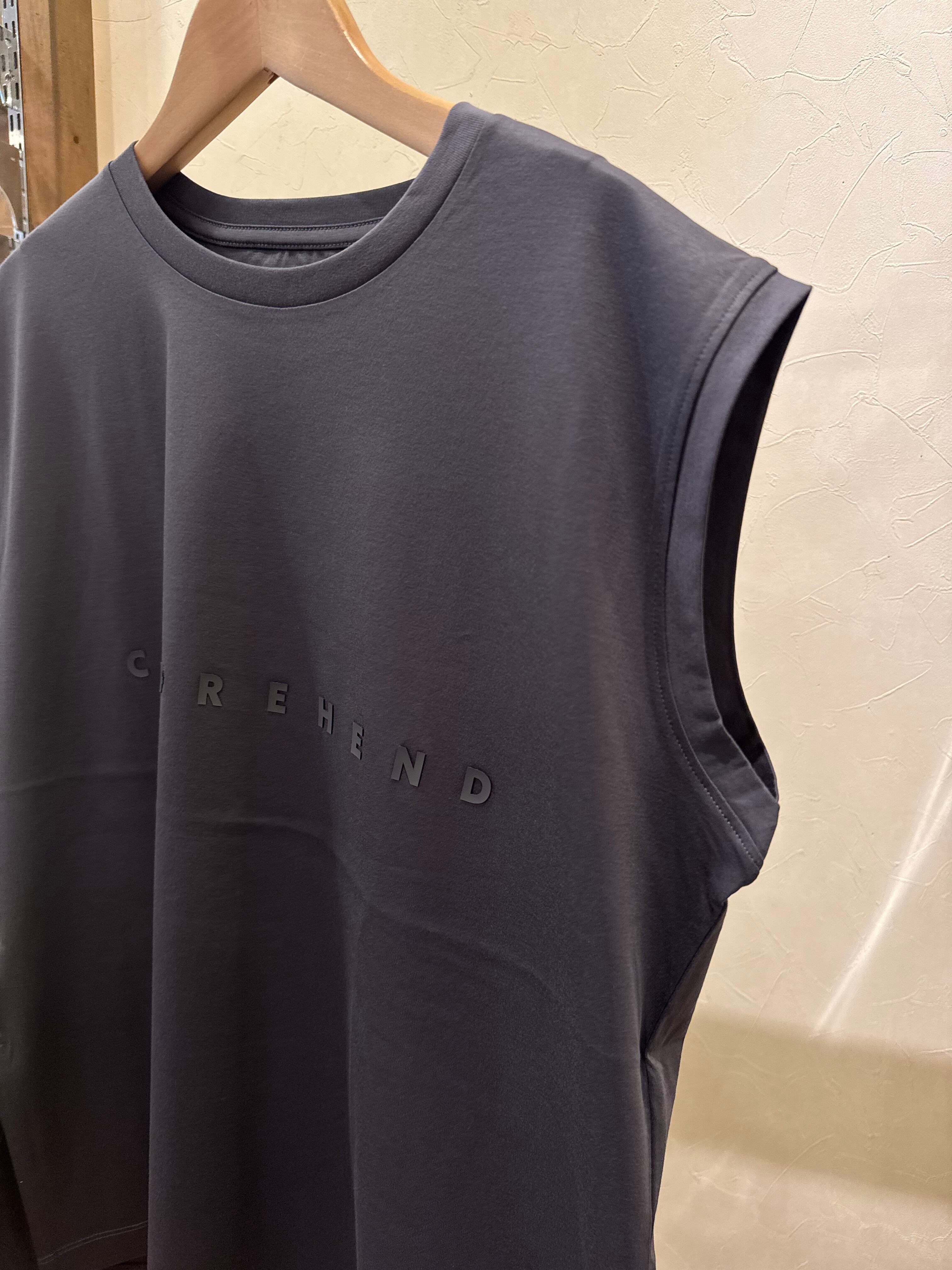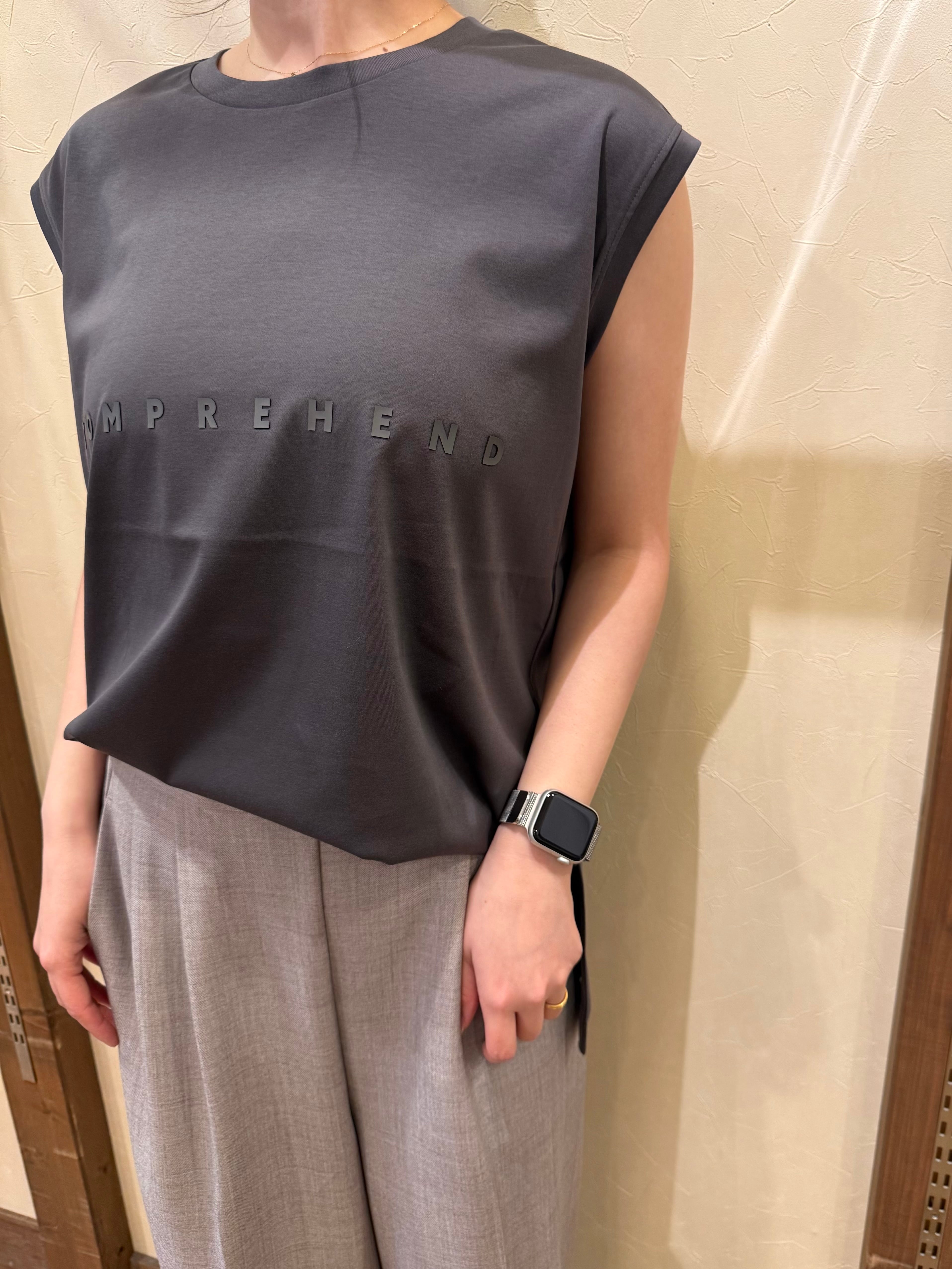 こなれ感のあるミニマムなロゴプリントを、何度も重ねたシリコンプリントで表現しました。サイドから見える色と表面の色も変え、立体的なロゴで高見えします。アームホール下がりは、より着用しやすいように微調整して上げています。
